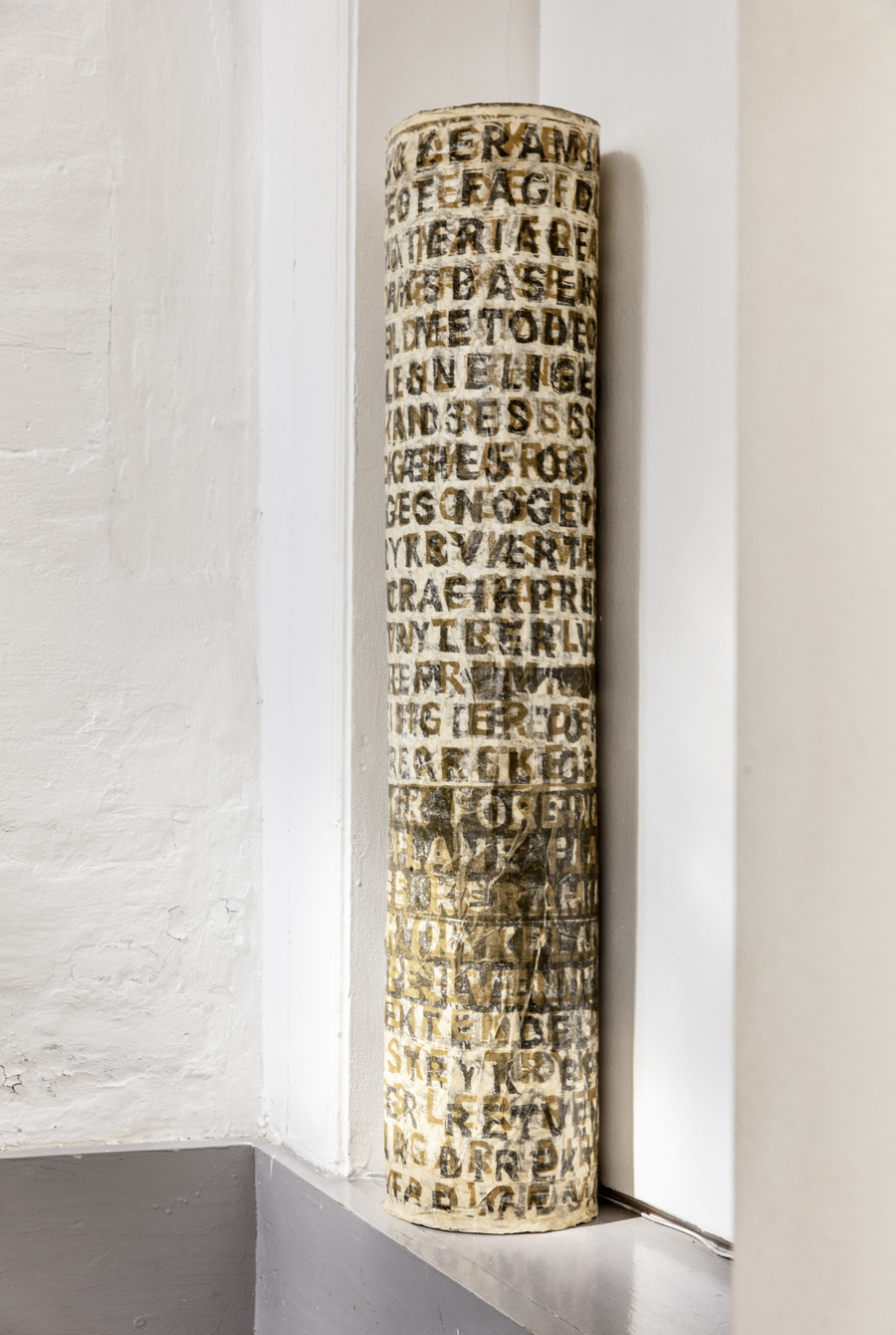 Skulptur; grafiske tryk på Kozo 25g papir, benlim, ler; 100 x 19 cm
